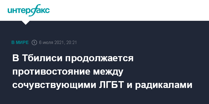 Москва. 6 июля. INTERFAX.RU - В центре Тбилиси в эти часы вновь, как и накануне, продолжается противостояние между радикально настроенными и сочувствующими ЛГБТ-сообществу людьми. Противостоящие стороны, в каждом лагере из которых находятся несколько сот человек, разделяют полицейские кордоны.
