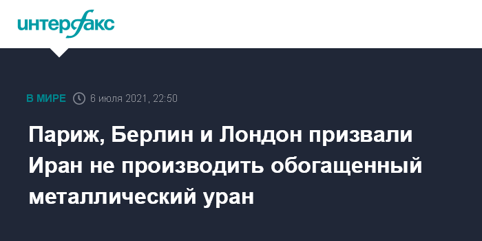 Москва. 6 июля. INTERFAX.RU - Планы Ирана по производству обогащенного металлического урана ставят под угрозу переговоры в Вене по иранскому атому, заявили во вторник главы МИД Франции, ФРГ и Великобритании Жан-Ив Ле Дриан, Хайко Маас и Доминик Рааб.