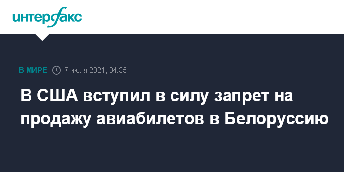 Москва. 7 июля. INTERFAX.RU - Министерство транспорта США сообщило о введении в действие приказа о запрете продажи билетов на авиаперелеты между Соединенными Штатами и Белоруссией.
