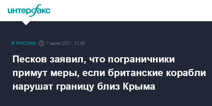 Москва. 7 июля. INTERFAX.RU - В Москве обеспокоены заявлениями из Лондона о намерении продолжить практику нарушения госграниц РФ британскими кораблями в акватории Черного моря в районе Крыма, в случае таких инцидентов будут предприниматься все необходимые меры, заявил пресс-секретарь президента РФ Дмитрий Песков.