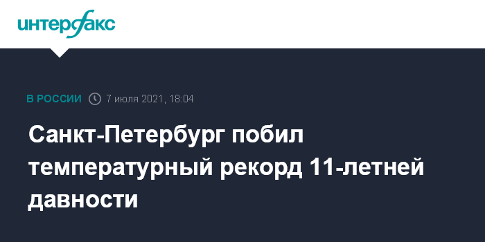 Москва. 7 июля. INTERFAX.RU - В Санкт-Петербурге в среду, 7 июля, побит температурный рекорд 11-летней давности, сообщил "Интерфаксу" главный синоптик города Александр Колесов.