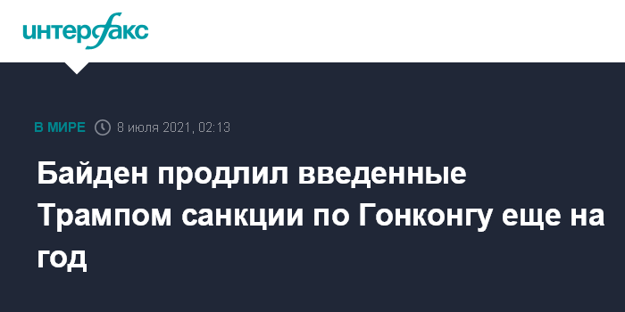Москва. 8 июля. INTERFAX.RU - Президент США Джо Байден продлил санкции по Гонконгу, введенные его предшественником Дональдом Трампом, сообщает Белый дом.