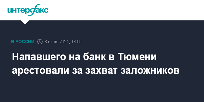Москва. 8 июля. INTERFAX.RU - Суд в Тюмени арествоал мужчину, который накануне захватил заложников в отделении банка в Тюмени и требовал 15 млн рублей.