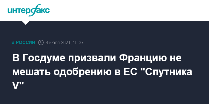 Москва. 8 июля. INTERFAX.RU - Спикер Госдумы Вячеслав Володин призвал власти Франции не пытаться чинить препятствия к признанию регулятором ЕС российской COVID-вакцины "Спутник V" и китайской вакцины Sinopharm.
