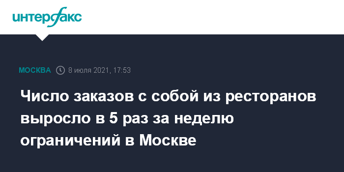 Москва. 8 июля. INTERFAX.RU - За первую неделю действия новых правил посещения московских ресторанов по QR-кодам число заказов с собой выросло в пять раз относительно предыдущей недели, свидетельствуют данные сервиса "Яндекс.Еда".