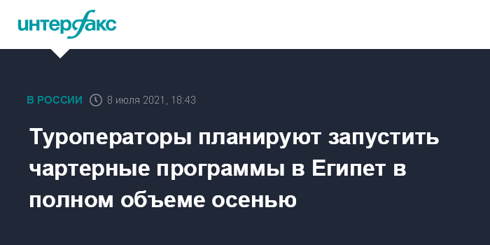 Москва. 8 июля. INTERFAX.RU - Туроператоры, вероятнее всего, запустят чартерные программы в Египет в полном объеме осенью, когда в стране наступает высокий туристический сезон, сообщили порталу "Интерфакс-Туризм" в пресс-службе туроператора "Интурист".