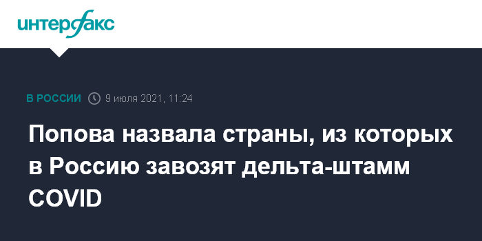 Москва. 9 июля. INTERFAX.RU - Вариант "дельта" (так называемый индийский штамм) коронавируса COVID-19 россияне привозят в основном с отдыха на Мальдивских островах, из нескольких европейских стран, где он получил наибольшее распространение, и из США, заявила глава Роспотребнадзора Анна Попова.