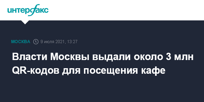 Москва. 9 июля. INTERFAX.RU - Около 3 млн QR-кодов получили жители Москвы, порядка 7 тысяч московских предприятий отчитались о вакцинации сотрудников первым компонентом вакцины от коронавируса, сообщил в пятницу мэр Москвы Сергей Собянин.