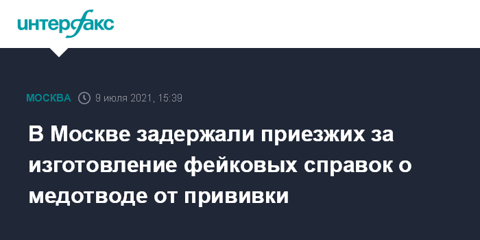 Москва. 9 июля. INTERFAX.RU - В Москве задержали подозреваемых в изготовлении и сбыте справок о медицинском отводе от вакцинации от коронавируса, сообщили в пресс-службе столичного главка МВД.