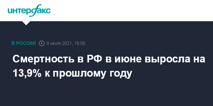 Москва. 9 июля. INTERFAX.RU - Смертность в РФ в июне, по оперативным данным, возросла на 13,9% по сравнению с июнем 2020 года из-за резкого подъема заболеваемости COVID-19 на фоне распространения варианта "дельта", сообщила вице-премьер Татьяна Голикова.