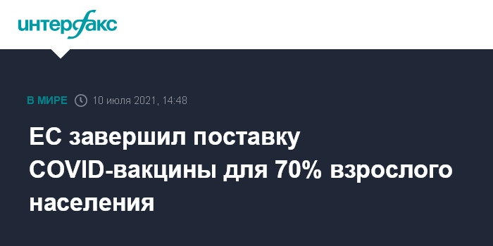 Москва. 10 июля. INTERFAX.RU - ЕС закупил и поставил странам-членам Союза вакцины против СOVID-19 для вакцинации 70% взрослого населения, сообщила председатель Европейской комиссии (ЕК) Урсула фон дер Ляйен.