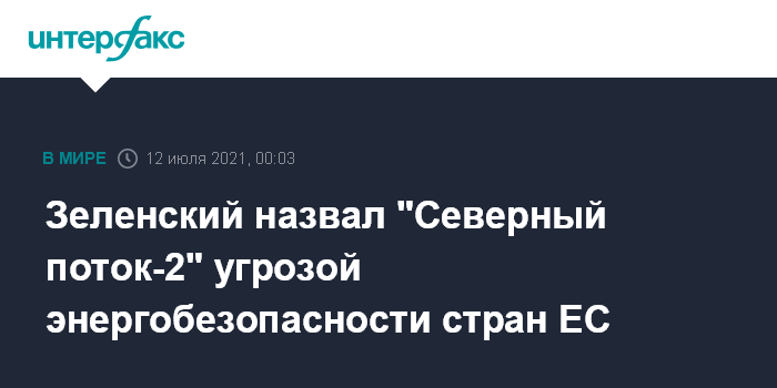 Москва. 11 июля. INTERFAX.RU - Президент Украины Владимир Зеленский считает, что введение в эксплуатацию "Северного потока-2" напрямую грозит энергетической безопасности стран Европейского союза, сообщила пресс-служба главы государства.