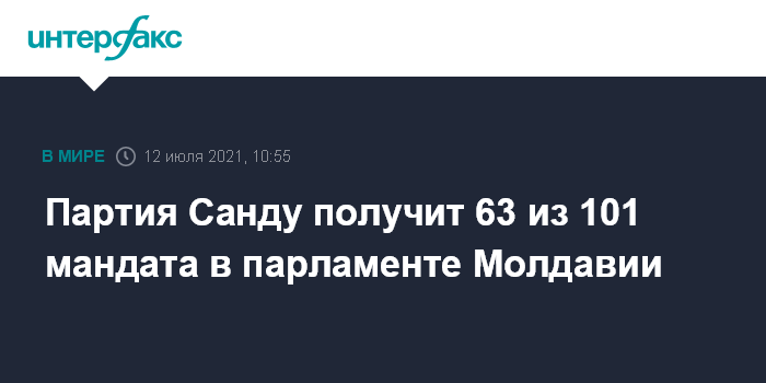 Москва. 12 июля. INTERFAX.RU - По итогам парламентских выборов в Молдавии партия "Действие и солидарность" (PAS), которая поддерживает проевропейского президента Майю Санду, получит около 52,72% голосов или абсолютное большинство мандатов, показывают предварительные результаты Центризбиркома, опубликованные утром 12 июля.