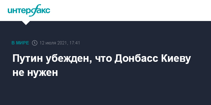Москва. 12 июля. INTERFAX.RU - Президент РФ Владимир Путин считает, что киевские власти не заинтересованы в мирном возвращении Донбасса, потому что это помешает строить политику Украины на образе врага в лице России.
