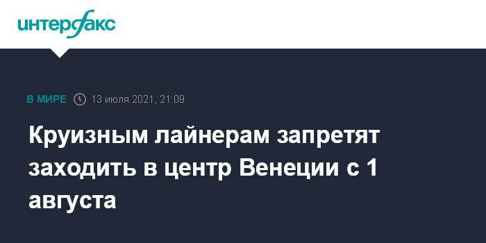 Москва. 13 июля. INTERFAX.RU - Круизным лайнерам с 1 августа будет запрещено заходить в центр Венеции, сообщает ANSA.