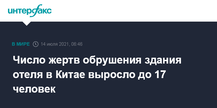 Москва. 14 июля. INTERFAX.RU - Число жертв в результате обрушения здания отеля "Кайюань" в городе Сучжоу (провинция Цзянсу) выросло до 17 человек, сообщили местные власти в среду.