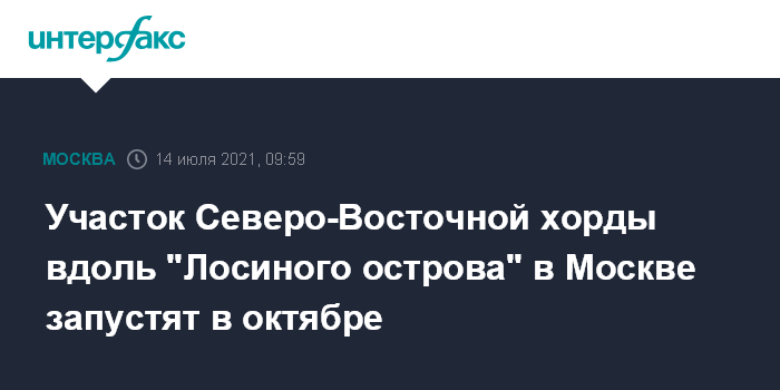 Москва. 14 июля. INTERFAX.RU - Движение по участку Северо-Восточной хорды (СВХ), проходящему вдоль национального парка "Лосиный остров" в Москве, планируется запустить в октябре этого года, сообщил "Интерфаксу" первый заместитель главы городского департамента строительства Петр Аксенов.