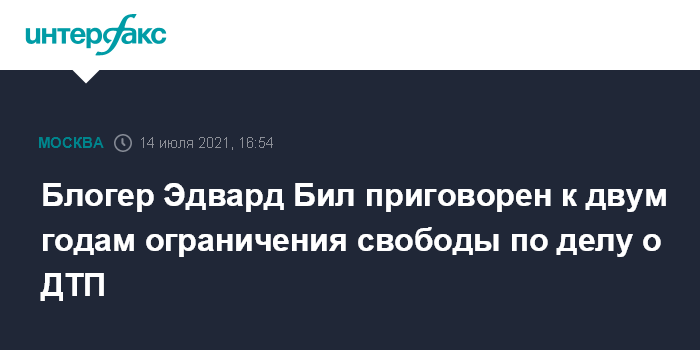 Москва. 14 июля. INTERFAX.RU - Пресненский суд Москвы приговорил блогера Эдуарда Биля (известен как Эдвард Бил) к двум годам ограничения свободы и лишению прав на три года за апрельское ДТП, в результате которого пострадала женщина. Об этом журналистам сообщила представитель городской прокуратуры Людмила Нефедова.