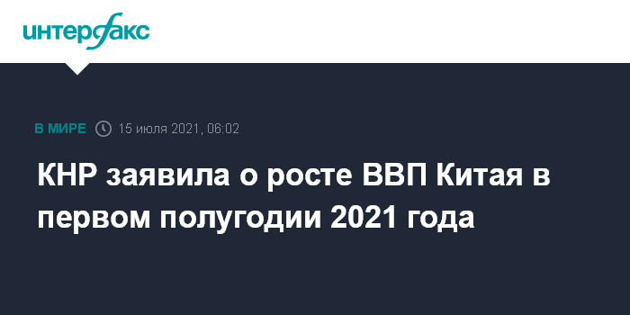 Москва. 15 июля. INTERFAX.RU - За первые шесть месяцев 2021 года ВВП Китая, по предварительным данным, вырос на 12,7%, сообщило в четверг Государственное статистическое управление КНР.