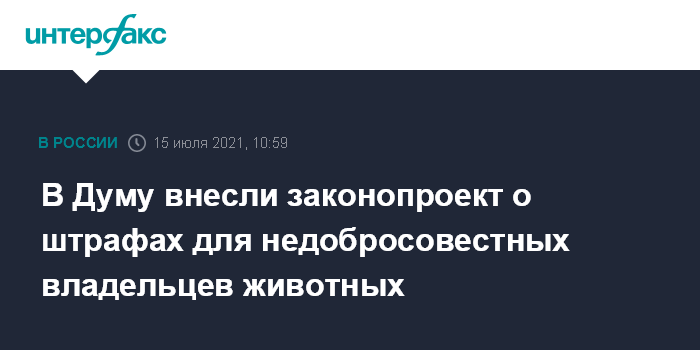 Москва. 15 июля. INTERFAX.RU - Председатели комитета Госдумы по государственному строительству Павел Крашенинников и комитета по экологии Владимир Бурматов (оба - "Единая Россия") внесли в палату законопроект о штрафах за нарушения правил обращения с животными.