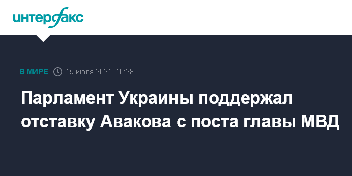 Москва. 15 июля. INTERFAX.RU - Верховная рада Украины на заседании в четверг поддержала отставку министра внутренних дел Арсена Авакова.