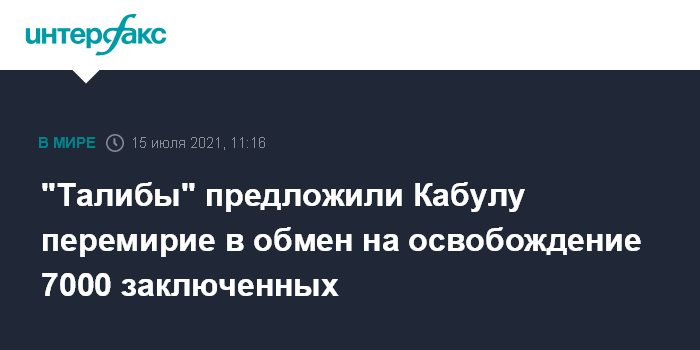 Москва. 15 июля. INTERFAX.RU - Боевики "Талибана" (движение признано в России террористическим и запрещено) предложили правительству Афганистана трехмесячное перемирие в обмен на освобождение 7 тысяч заключенных и исключение имен лидеров движения из "черного списка ООН".