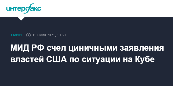 Москва. 15 июля. INTERFAX.RU - Москва считает циничными заявления Вашингтона по ситуации на Кубе, призывает США не вмешиваться во внутренние дела этого государства, а оказать реальную помощь, заявила в четверг официальный представитель МИД РФ Мария Захарова.