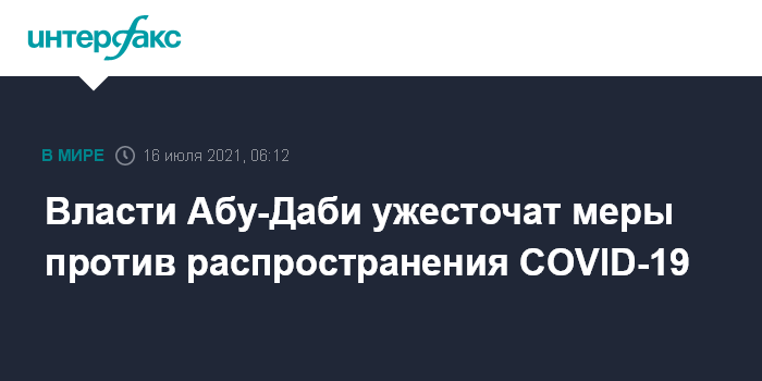 Москва. 16 июля. INTERFAX.RU - Власти эмирата Абу-Даби ОАЭ объявили о новых мерах, направленных на предотвращение рисков распространения коронавируса, которые начинают действовать с понедельника.
