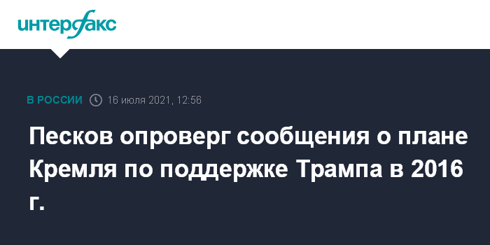 Москва. 16 июля. INTERFAX.RU - Пресс-секретарь президента РФ Дмитрий Песков назвал "полной неправдой" и образцовым фейком статью Guardian о том, что Владимир Путин в 2016 году дал разрешение на операцию по поддержке Дональда Трампа в президентской кампании.