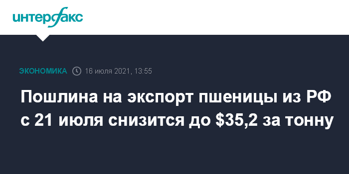 Москва. 16 июля. INTERFAX.RU - Экспортная пошлина на пшеницу с 21 июля снизится до $35,2 за тонну против пошлины в $39,3 за тонну, которая действует по 20 июля, следует из данных Минсельхоза РФ.
