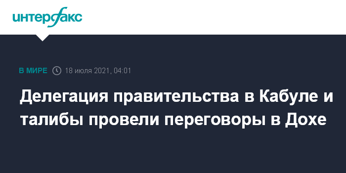 Москва. 18 июля. INTERFAX.RU - Высокопоставленная делегация правительства в Кабуле и представители афганского движения "Талибан" (запрещено в РФ как террористическое) встретились в субботу в Дохе для переговоров по вопросам урегулирования ситуации в стране, первый день не принес конкретных результатов, сообщил телеканал "Аль-Джазира".