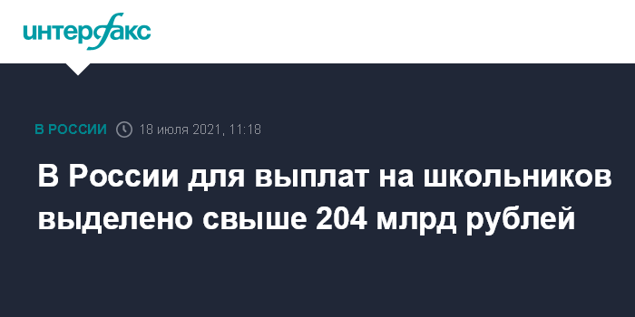 Москва. 18 июля. INTERFAX.RU - Свыше 204 млрд рублей выделено в России для выплат на школьников. "По указу президента все семьи, в которых растут дети школьного возраста, к началу учебного года получат по 10 тыс. рублей на каждого такого ребенка. Распоряжение о выделении на эти цели более 204 млрд рублей подписал председатель правительства Михаил Мишустин", - сообщили в воскресенье в пресс-службе правительства РФ.