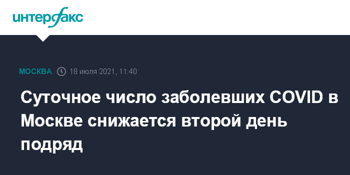 Москва. 18 июля. INTERFAX.RU - Более 4,3 тыс. случаев заболевания коронавирусом зафиксировали в Москве за сутки, этот показатель продолжает снижаться второй день подряд, следует из данных оперативного штаба по контролю ситуации с COVID-19.