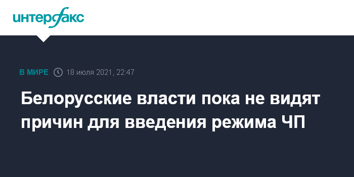 Москва. 18 июля. INTERFAX.RU - Власти Белоруссии не видят оснований для введения режима чрезвычайного положения в республике и обещают не допустить этого. Об этом заявил заместитель госсекретаря Совета безопасности Белоруссии Александр Рахманов в эфире государственного телеканала ОНТ в воскресенье.