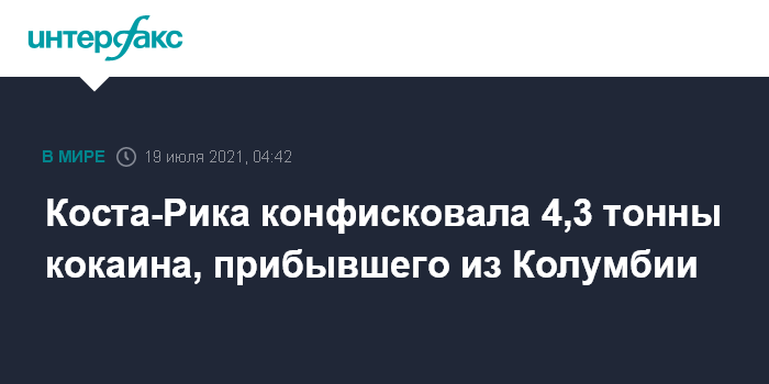 Москва. 19 июля. INTERFAX.RU - Полиция Коста-Рики в воскресенье изъяла крупную партию кокаина, произведенного в Колумбии, сообщают местные СМИ.