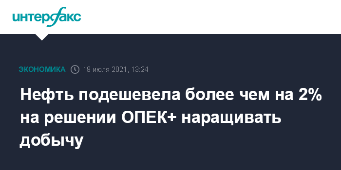 Москва. 19 июля. INTERFAX.RU - Цены на нефть ускорили падение в ходе торгов в понедельник, теряя более 2% на фоне решения ОПЕК+ наращивать добычу.