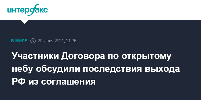 Москва. 20 июля. INTERFAX.RU - Страны-участницы Договора по открытому небу (ДОН) во вторник провели видеоконференцию, в ходе которой обсудили последствия выхода России из него, говорится в заявлении ОБСЕ, распространенном по итогам конференции.