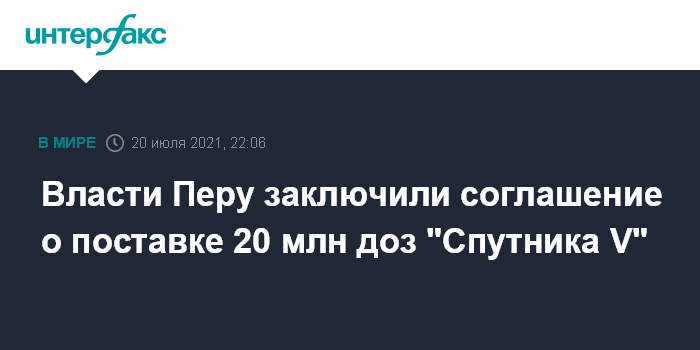 Москва. 20 июля. INTERFAX.RU - Власти Перу подписали соглашение о закупке 20 млн доз российской вакцины от коронавируса COVID-19 "Спутник V", сообщил во вторник временный перуанский президент Франсиско Сагасти.