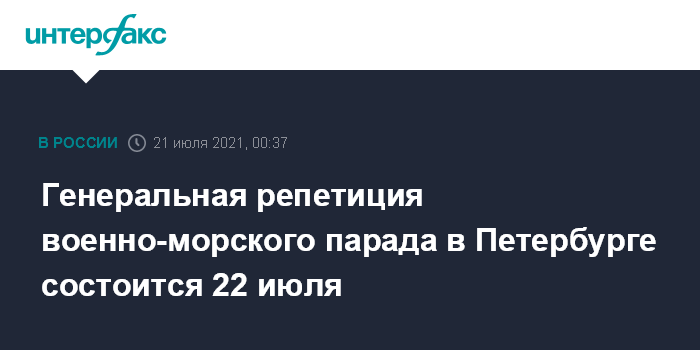Об этом говорится в новом мультимедийном разделе на сайте Минобороны, посвящённом предстоящему пятому главному военно-морскому параду. Согласно интернет-порталу, генеральная репетиция главного военно-морского парада в Санкт-Петербурге состоится 22 июля.