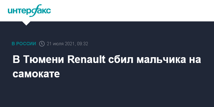 Москва. 21 июля. INTERFAX.RU - В Тюмени легковая Renault во дворе многоквартирного дома на Московском тракте сбила мальчика, который выехал из подъезда на самокате. Об этом сообщили в региональном управлении ГИБДД. ДТП произошло во вторник вечером. Его обстоятельства устанавливаются.