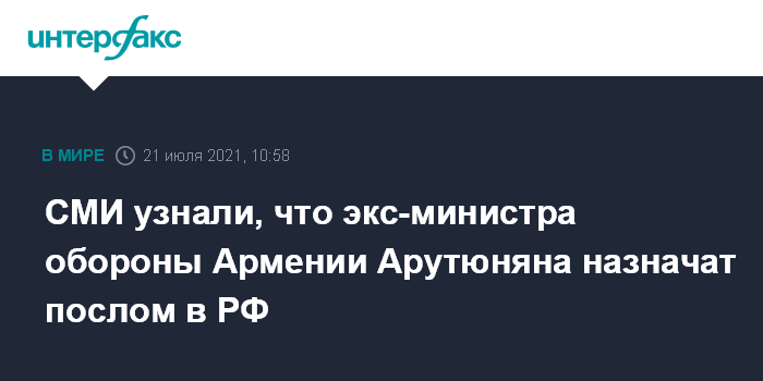 Москва. 21 июля. INTERFAX.RU - Освобожденного от должности исполняющего обязанности министра обороны Армении Вагаршака Арутюняна планируется назначить послом в РФ, сообщают армянские СМИ.