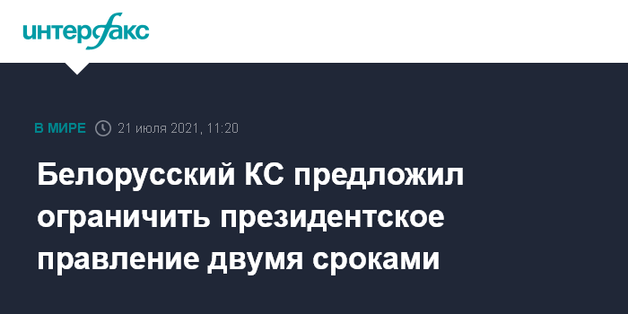 Москва. 21 июля. INTERFAX.RU - В Белоруссии предложено ограничить пребывание в должности президента двумя сроками и повысить до 40 лет возрастной ценз для избрания на этот пост.