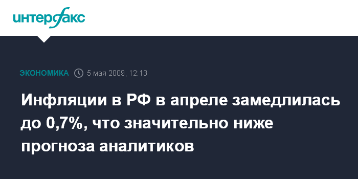 Москва. 5 мая. INTERFAX.RU - Инфляция в России в апреле 2009 г. составила 0,7% по сравнению с 1,3% в марте 2009 года и 1,4% за апрель 2008 года, сообщила во вторник Федеральная служба государственной статистики (Росстат).
