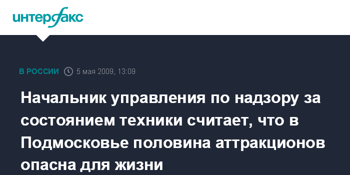 Москва. 5 мая. INTERFAX.RU - В Подмосковье половина из 270 зарегистрированных аттракционов представляет опасность для жизни, заявил журналистам начальник главного областного управления по надзору за техническим состоянием самоходных машин и других видов техники Виталий Дубровин.