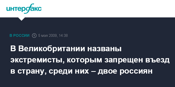 Москва. 5 мая. INTERFAX.RU - Власти Великобритании опубликовали список лиц, которым запрещен въезд в страну в связи с их деятельностью по распространению экстремизма и различных видов социальной вражды, сообщает британская телерадиокорпорация BBC.
