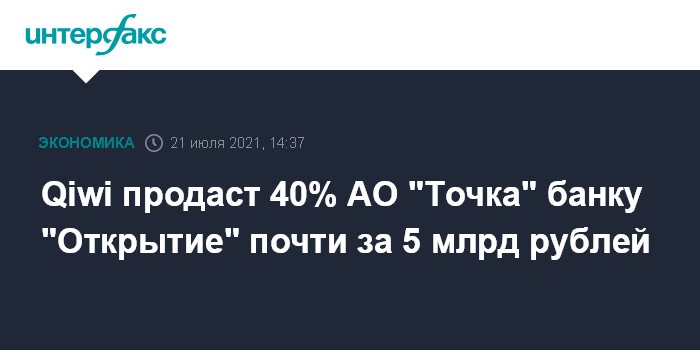 Москва. 21 июля. INTERFAX.RU - Qiwi заключила соглашение с банком "Открытие" о продаже ему 40% АО "Точка" (45% экономической доли компании), говорится в сообщении группы.