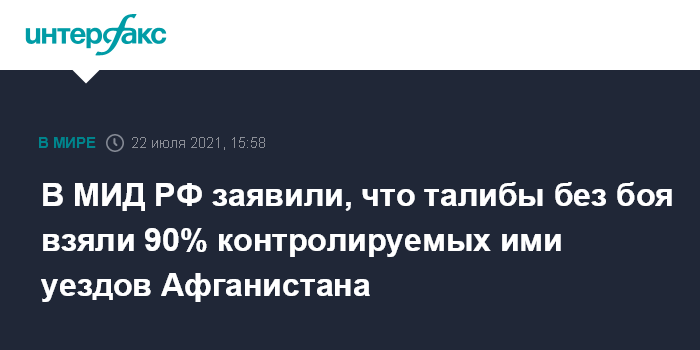 Москва. 22 июля. INTERFAX.RU - Талибы (движение "Талибан" запрещено в РФ) в настоящее время контролируют 70-80 уездов в Афганистане, 90% из них они взяли без боя, сообщил спецпредставитель президента РФ по Афганистану, директор Второго департамента Азии МИД РФ Замир Кабулов.