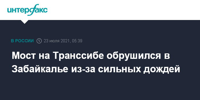 Москва. 23 июля. INTERFAX.RU - Железнодорожный мост на Транссибирской магистрали между станциями Куэнга и Укурей Забайкальского края обрушился утром в пятницу из-за сильных дождей, сообщает ГУ МЧС по региону.