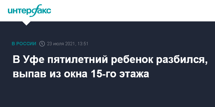 Москва. 23 июля. INTERFAX.RU - Пятилетняя девочка погибла в Уфе в результате падения из окна квартиры на 15-м этаже. Об этом сообщила пресс-служба УМВД России по городу.