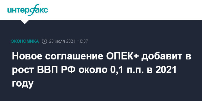 Москва. 23 июля. INTERFAX.RU - Наращивание обычи нефти по обновленному соглашению ОПЕК+ добавит к росту российской экономики в 2021 году порядка 0,1 процентного пункта (п.п.), в 2022 году - 0,2-0,3 п.п., сообщила председатель Банка России Эльвира Набиуллина. Она сослалась на предварительные оценки ЦБ.